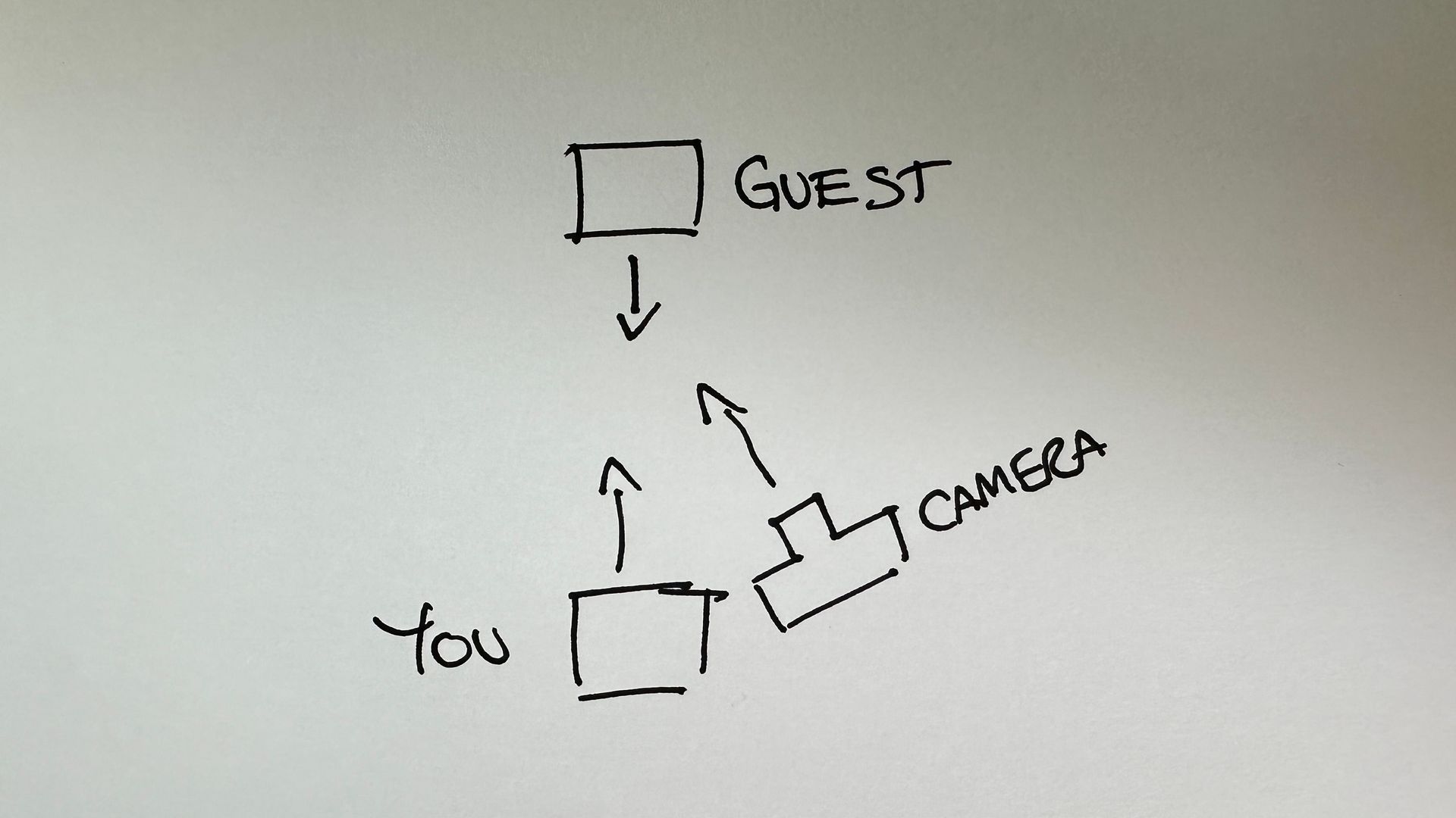 Having your guest look at you rather than the camera has the fringe benefit of helping your guest relax. If they're not confident talking to camera now they don't have to. They can ignore the camera entirely and just chat with you. Now that's much easier.
